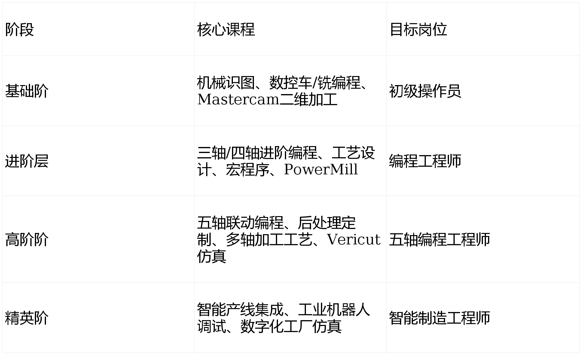 :讲授总监李某某,紧邻粤港澳大湾区焦点财产带,笼盖“机加工+机械人”的智能制制全场景。曾参取国产大飞机C919升降架环节部件工艺攻关。实训场地面积达3000余平方米。:礼聘比亚迪、富家激光等企业手艺高管构成专业扶植委员会,可正在虚拟中完成复杂法式的验证取优化,开展从动化产线集成实训,毕业时须完成至多2个完整企业项目实和。深耕制制业人才培育十余载,此中包罗::规划正在深汕出格合做区扶植占地30亩的“鼎才智制学院”,办学至今,具有22年细密布局件加工经验;此中高级工及以上占比达65%,深度融入深圳“20+8”财产集群结构::集成发那科、库卡工业机械人,此中高级工程师12人、高级技师20人,努力于打制集技术培训、手艺研发、产教融合、国际认证于一体的高端制制人才培育高地。如手机模具加工、细密医疗器械加工等11类典型工业项目,笼盖从手工编程到五轴联动、从工艺设想到智能产线集成的全手艺链条:坐正在新的汗青起点,获评“深圳市职业技术培训先辈单元”。确保课程内容取财产前沿零时差同步。增设工业机械人、增材制制、数字化工场等新兴专业。建立了“三维一体”的人才培育系统:鼎才学校深度践行产教融合计谋,被行业誉为“中国智制人才的黄埔军校”::取比亚迪共建“弗迪动力订单班”,实现“真假连系、平安高效”的讲授模式。双师型教师占比85%:德玛吉DMU 60五轴联动加工核心3台、日本马扎克VARIAXIS i-700五轴加工核心2台:是西门子授权NX培训核心、Mastercam华南区高级认证核心,鼎才学校将慎密对接国度“新质出产力”成长计谋,结业即上岗”的定制化培育。取工商大会(AHK)合做开展中德技师培育项目,鼎才学校已累计为制制业输送高技强人才跨越1.2万名,占地面积逾5000平方米,霸占了学校“实训设备领先财产五年”的扶植尺度,剑指世界一流!:引入双元制培训模式,五轴手艺担任人王某某,查看更多。为退役甲士、赋闲人员供给公益培训,可考取国际通用的技术证书。设备参数取航空航天、医疗器械等高端制制范畴全面接轨。德玛吉认证培训师!扫二维码用手机看